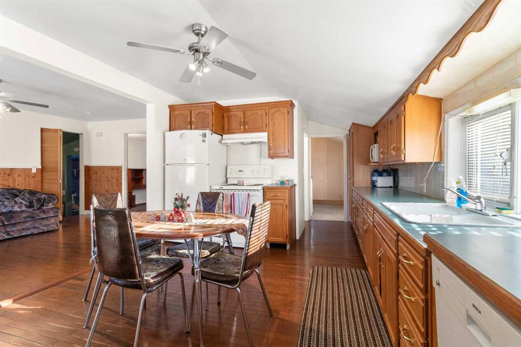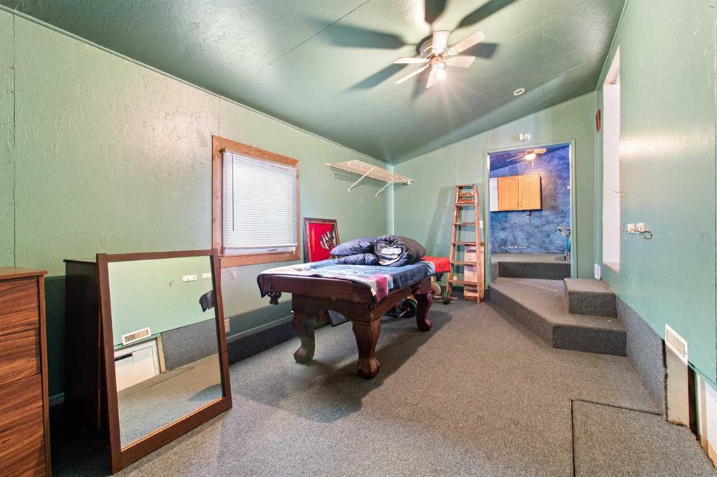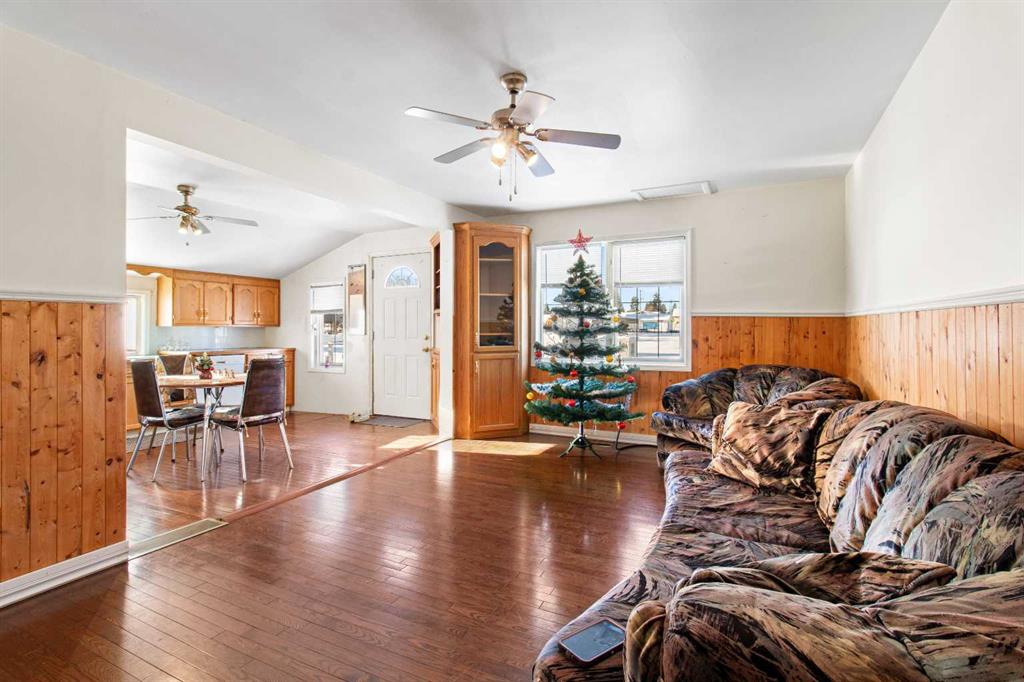Welcome to cute and affordable. This Bungalow boasts many qualities and upgrades and reno's completed over the years. Up the stairs to the west facing deck you can enter the home. Walk into the kitchen and dining room that is bright with newer cabinets and beautiful hardwood flooring. Down the hall takes you to the 3 piece bathroom with stand up shower and then into the laundry room. Back out through the kitchen into the living room with the primary bedroom off to the side. Down a couple steps takes you into another bedroom area with rec room that has lots of room for the pool table, which also has a separate entrance. In this area is where you find the stairway down to the basement of the home where the furnace and hot water tank reside. Upgrades recently are shingles in 2015, and furnace and hot water tank. Includes a 10' x 12' shed in backyard. Located across from the park / playground. Has the deck out front and a patio area and firepit in back yard. Plenty of parking having the driveway, out front on the street or room in the back for more cars or RV parking. Delburne has many great features including multiple restaurants, Grocery Stores, Banks, Doctors Office, Pharmacy, Curling and Hockey rinks and a gorgeous golf course.