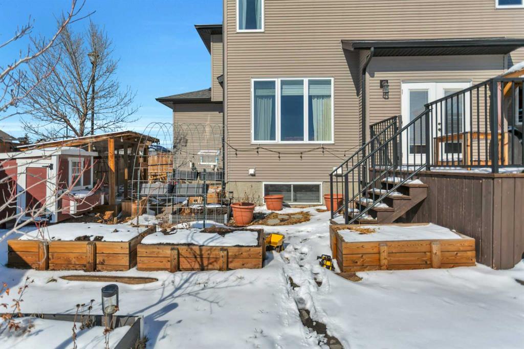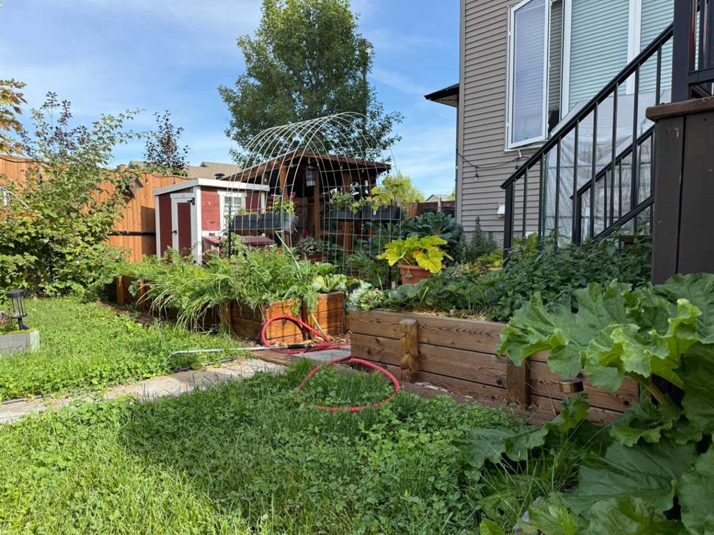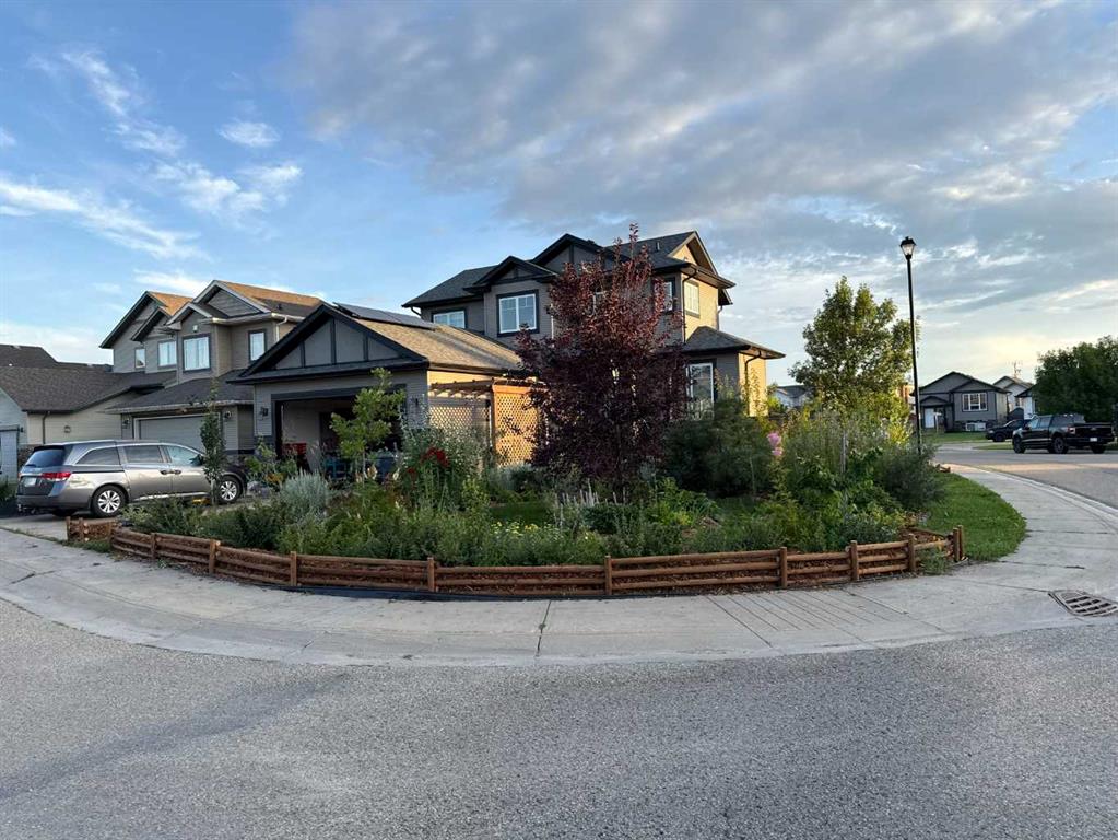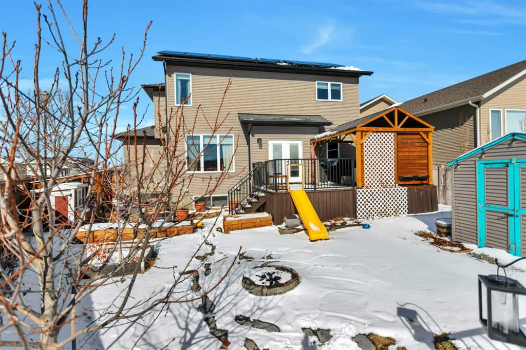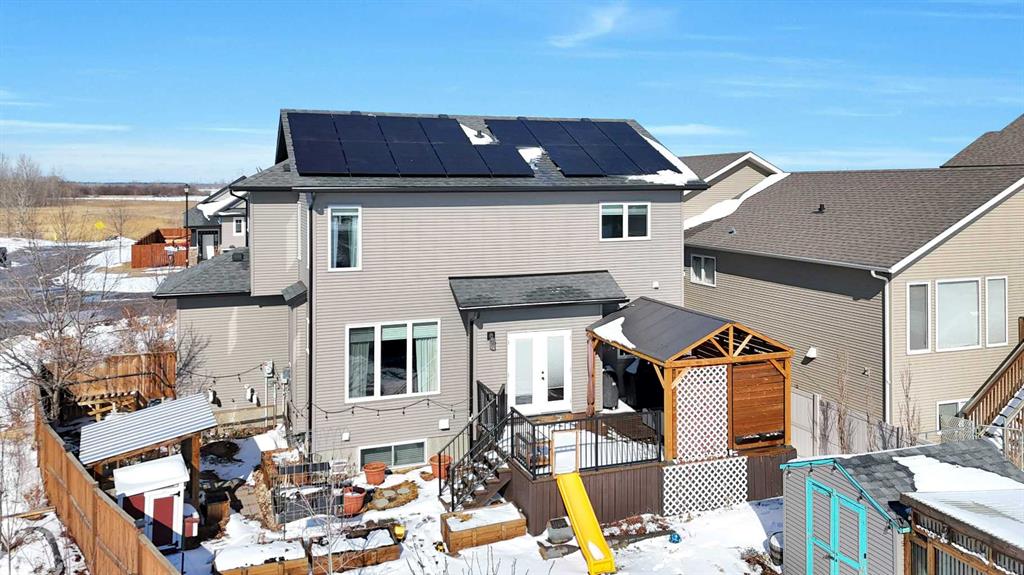 197 Sabre Road delivers with a 2-storey layout, heated garage, central air, and a finished basement with in-floor heat, all set on a 7000 sq ft corner lot minutes to Gasoline Alley and Red Deer. A well-designed 2-storey detached home offering 5 bedrooms, 3.5 bathrooms, and a layout that balances everyday function with standout features. The open concept main floor is ideal for both daily living and entertaining, anchored by a spacious kitchen with granite countertops, a island, and seamless flow into the dining and living areas. A gas fireplace adds warmth and comfort, while central air keeps the home cool through the summer months. A dedicated main floor office provides flexibility for remote work or study, and main floor laundry adds convenience. The double attached heated garage is perfect for Alberta winters. Upstairs, the primary bedroom is a true retreat with two walk-in closets and a private ensuite featuring a soaker tub and separate shower. Additional bedrooms offer space for family or guests. The fully developed basement includes in-floor heating, creating a comfortable extension of the home for recreation, movie nights, or hosting. Set on a 7000 sq ft corner lot, the outdoor space is built for lifestyle and utility. Enjoy the back deck with gazebo, fire table, and gas line for BBQs. The yard also features RV parking, raised garden beds, a greenhouse, chicken coop, and a storage shed. Solar panels contribute to energy efficiency.