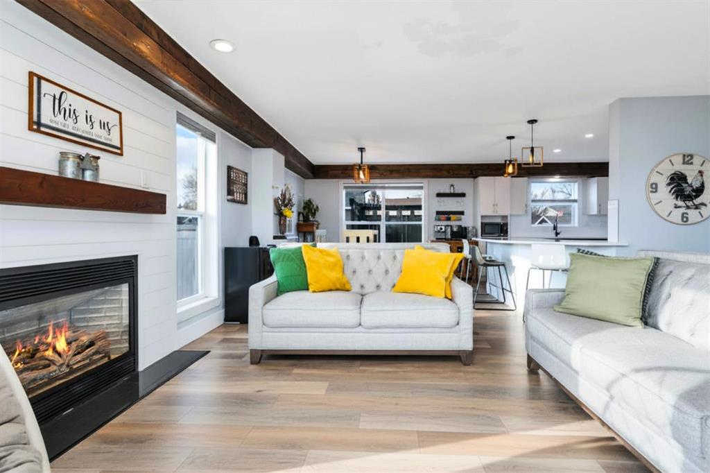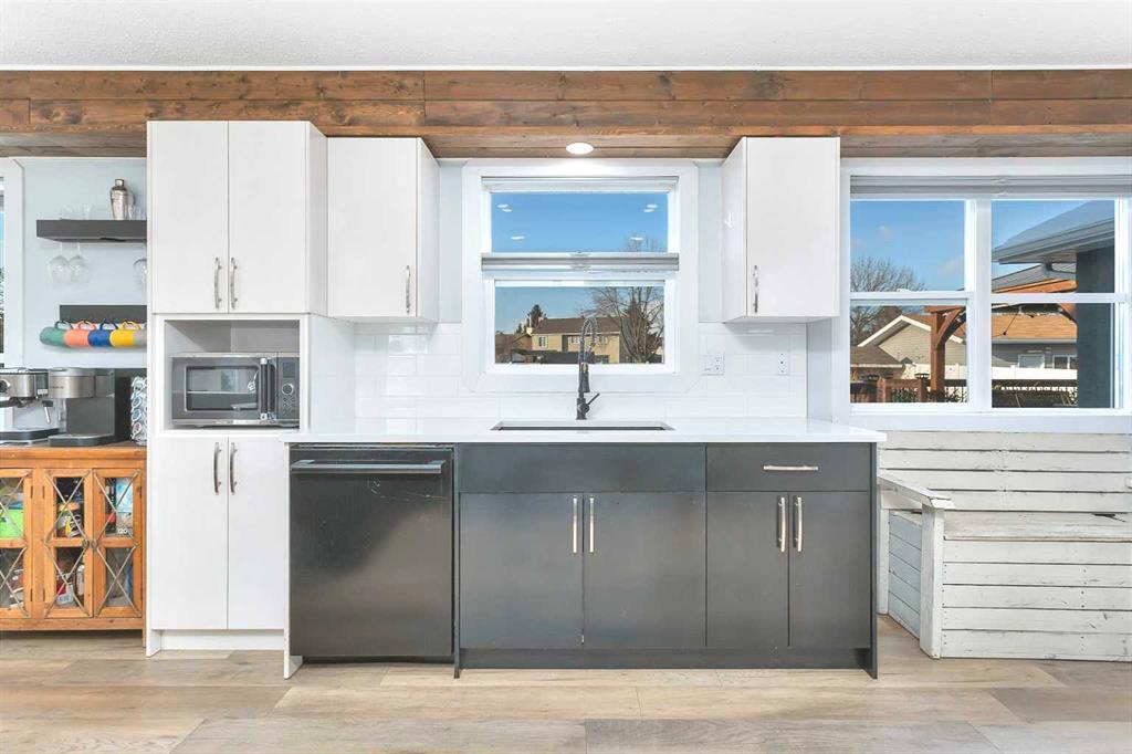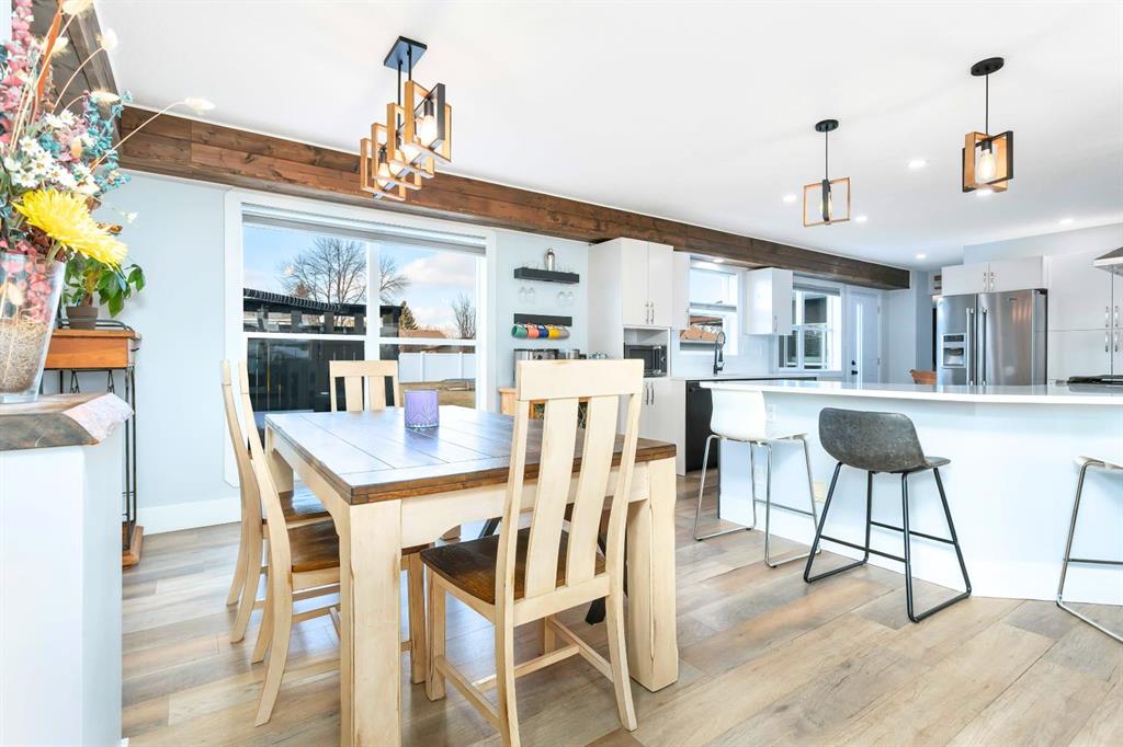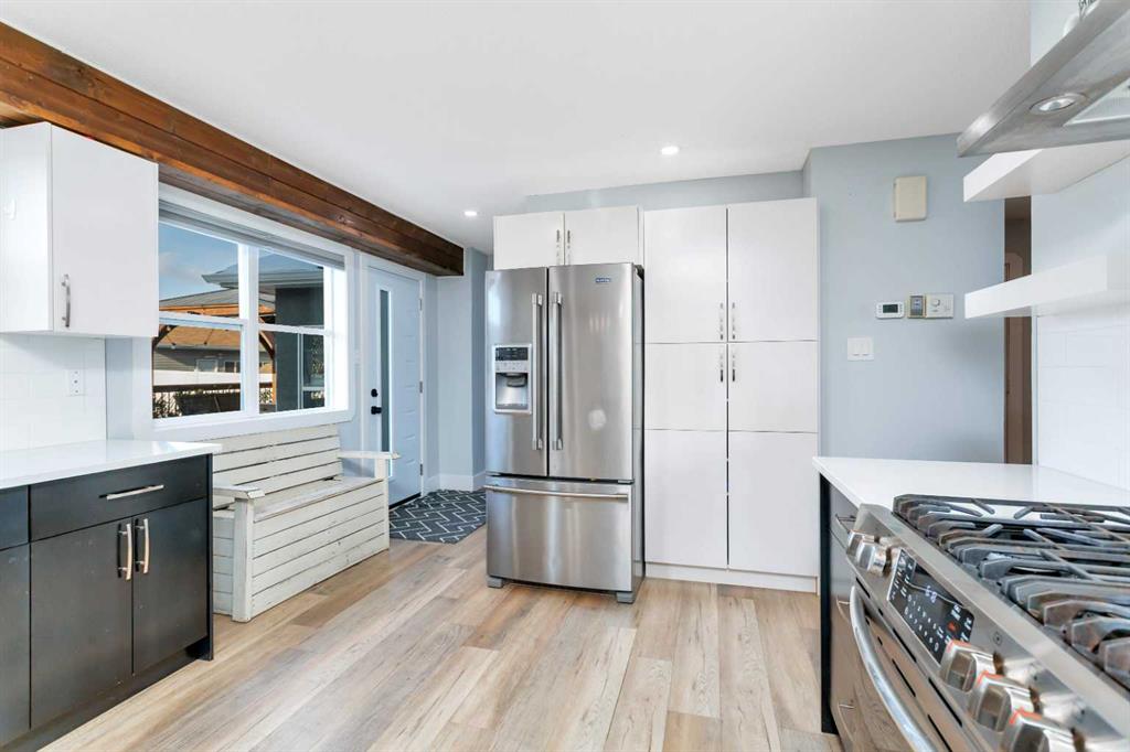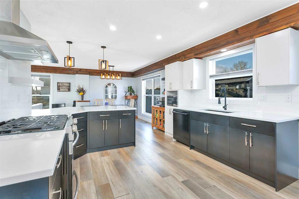 Inside, the light leads the way. South-facing windows anchor the main living space, drawing in sunshine that plays off crisp white walls, rustic barnboard-style flooring, and wood ceiling beams that add just the right amount of texture. The kitchen is designed for real living—room to spread out, cook together, gather, and stay awhile. Thoughtful details like the coffee bar, open shelving, and a view over the backyard make it feel connected and functional without ever feeling busy. Just off the kitchen, you’ll find main floor laundry and a refreshed powder room, along with easy access to the backyard for those in-and-out days.
