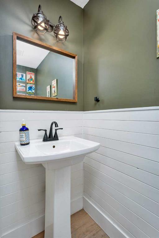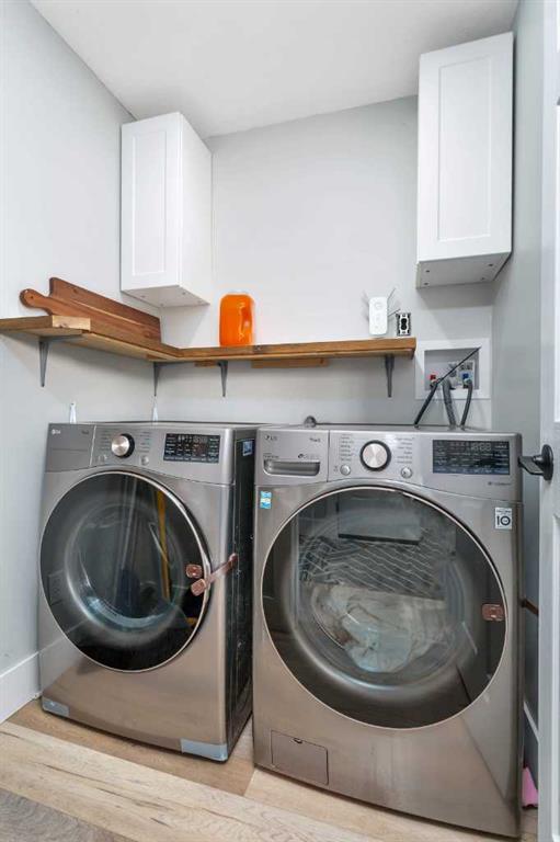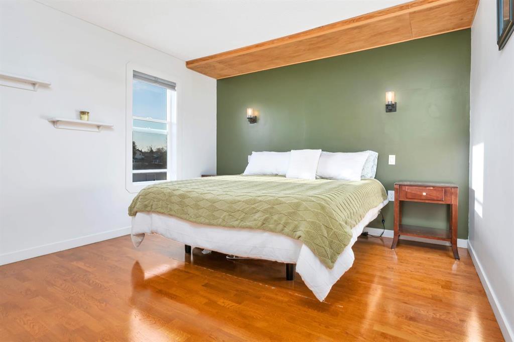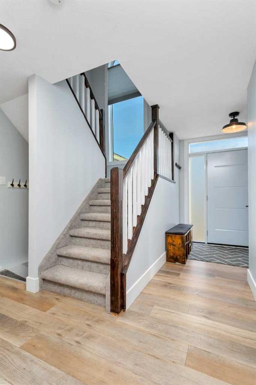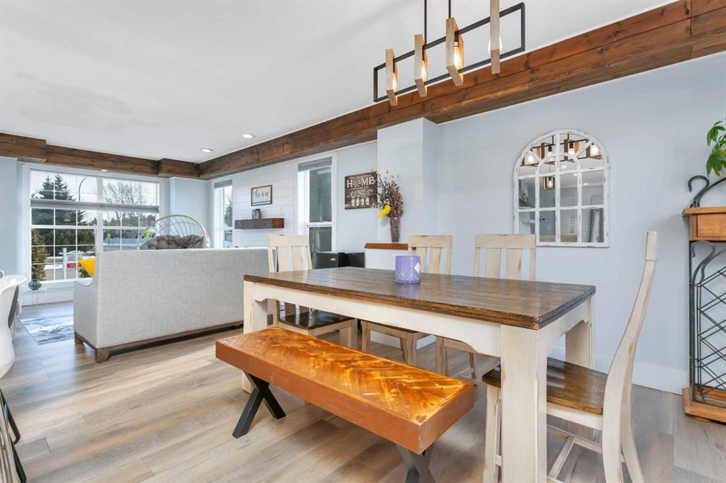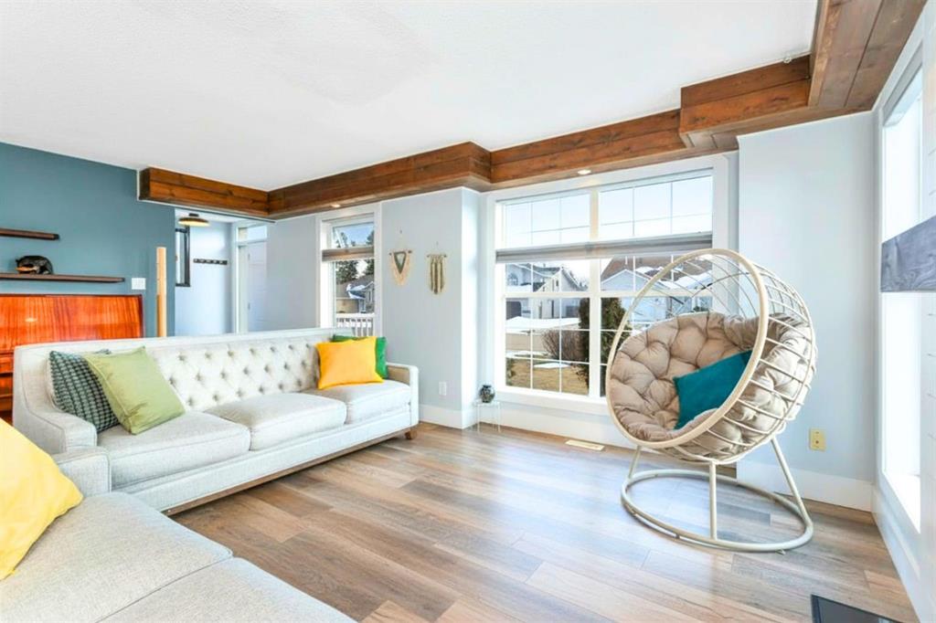Inside, the light leads the way. South-facing windows anchor the main living space, drawing in sunshine that plays off crisp white walls, rustic barnboard-style flooring, and wood ceiling beams that add just the right amount of texture. The kitchen is designed for real living—room to spread out, cook together, gather, and stay awhile. Thoughtful details like the coffee bar, open shelving, and a view over the backyard make it feel connected and functional without ever feeling busy. Just off the kitchen, you’ll find main floor laundry and a refreshed powder room, along with easy access to the backyard for those in-and-out days.