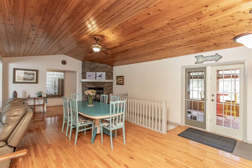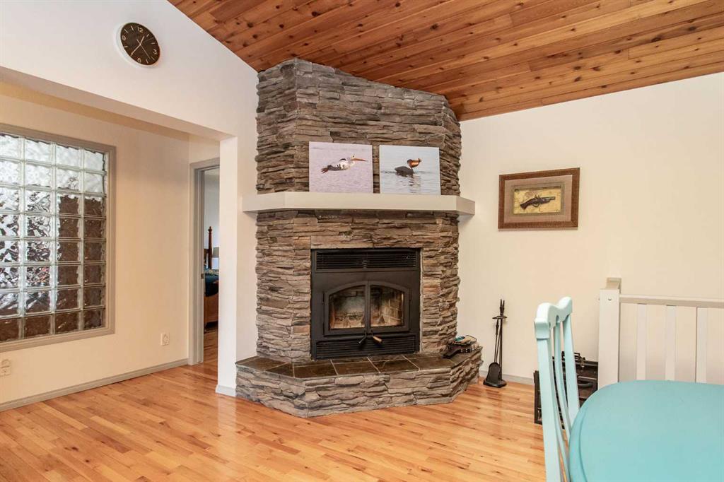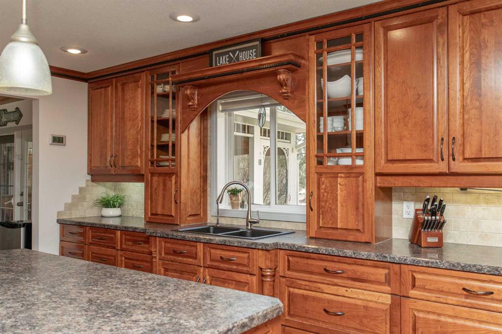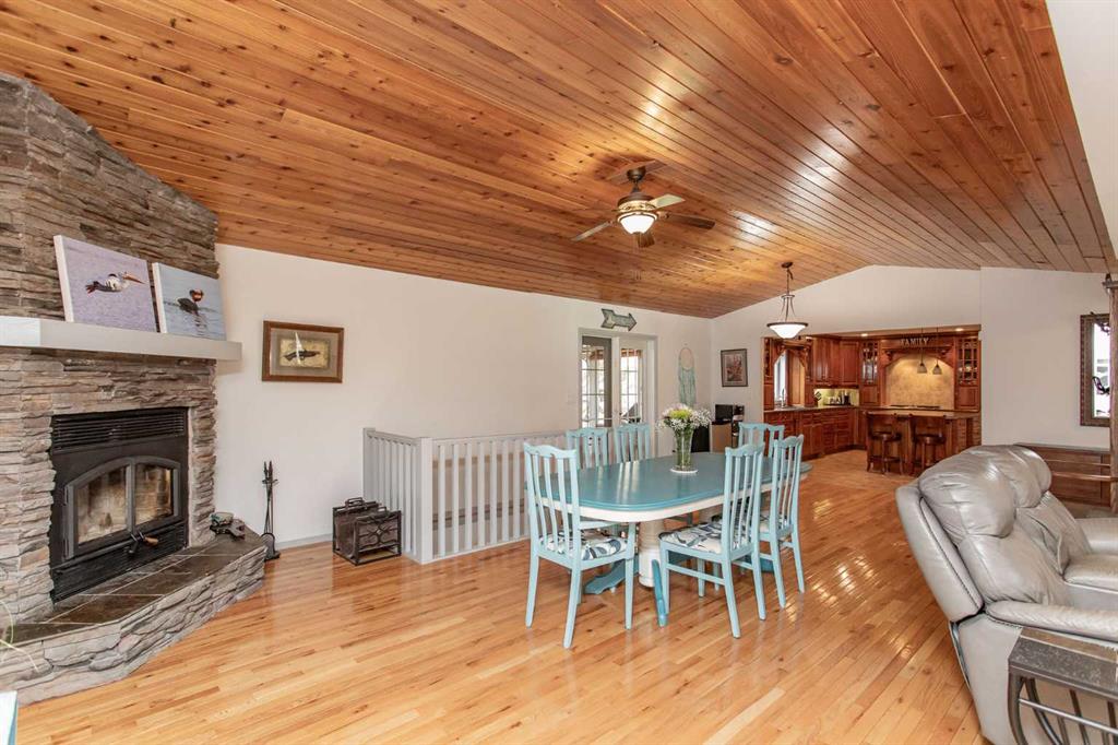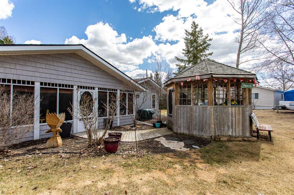 Experience the perfect balance of lakeside living and peaceful privacy in this exceptional property. 2944 square foot bungalow plus 1066 square feet of garage space! Set on a 0.68 acre lot away from city noise yet just minutes from the beach, this four-bedroom, three-bathroom home offers comfort, functionality, and room to grow. The open-concept main floor showcases a beautifully designed kitchen with rich cherrywood cabinetry, a large island with a built-in wine rack, and a gas burner stove—ideal for both everyday living and entertaining. A convenient main-floor laundry and a full bathroom with a luxurious soaker tub complete the space. The living and dining area is anchored by a striking stone-faced, wood-burning fireplace, while vaulted ceilings enhance the home’s bright, airy feel. The oversized 21' x 13'6" primary bedroom serves as a private retreat, featuring high ceilings, double doors, and a generous walk-through ensuite. The fully finished basement adds versatile living space with a family room, an additional bedroom, 3 piece bathroom and a den—perfect for guests, hobbies, or a home office. Additional features include air conditioning, a drilled water well, and a septic system with field. Plus for the person who loves spending time in the garage working on vehicles, tinkering on projects or wood working - this attached oversized four car garage is the perfect fit for the car enthusiast or hobbyist! Lots of room for vehicles with room to spare! Step outside to a spacious covered and screened-in deck (27' x 12'), extending your living space into the outdoors. The large, private yard is complete with a firepit, gazebo, and two storage sheds. Located near Buffalo Lake, a premier recreational destination, Pelican Point provides access to a public beach, campground, playground, and fully paved roads—making this an ideal year-round or seasonal retreat. Get ready to enjoy all the aspects of lake living - whether it being walking and cycling, lawn games, campfires, beach days or watersports - this exceptional property gives you an abundance of lake lifestyle and country-like living pleasures. Pelican Point is a welcoming neighborhood that has a community association that organizes community events to participate in and enjoy the comradery! Make your move -there is lots of time to enjoy winter activities still and be ready for summer at the lake!