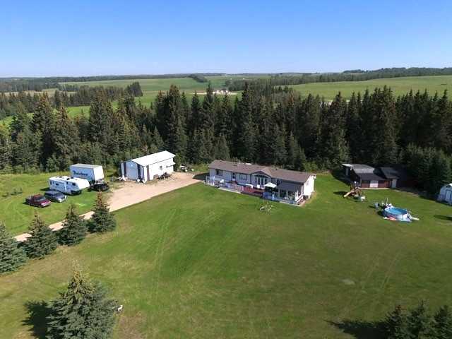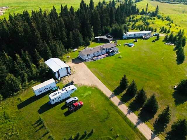 Welcome to freedoms of country living! With incredible views to the west and peaceful serenity of the river along the east, this acreage boasts prime location! Only 10 minutes from full services in the friendly community of Rimbey, moments from Spruce Haven Golf Course and within 7 minutes of Bluffton; aw-inspiring country lifestyle meets convenience. The driveway brings privacy yet currently generates income of $3600/year with convenient lease agreement. The landscaped front yard is partially fenced and features a small pond adding to your future oasis. With tons of covered outdoor storage, the large shop with extra power and spacious mezzanine loft await your desired finishing touches. Step inside and take in the great views of the west from the open concept living and dining area. A long breakfast bar connects the dining area to the very functional kitchen – making it an excellent space for family or entertaining. You will be pleasantly surprised by the size of the primary bedroom featuring a walk-in closet plus extra large ensuite. On the opposite end of the home, find a 2nd bedroom which can easily fit a queen and the 3rd bedroom which could fit a king plus features another walk-in closet. The 4 pc bathroom has great counterspace and humidity control. Back outside, the sunroom is wired for a hot tub and also has beautiful views of the front yard. Towards the mobile home, a second drilled water well and septic system is located on the east side of the property (included “as is). This superbly located acreage awaits its new owners today!