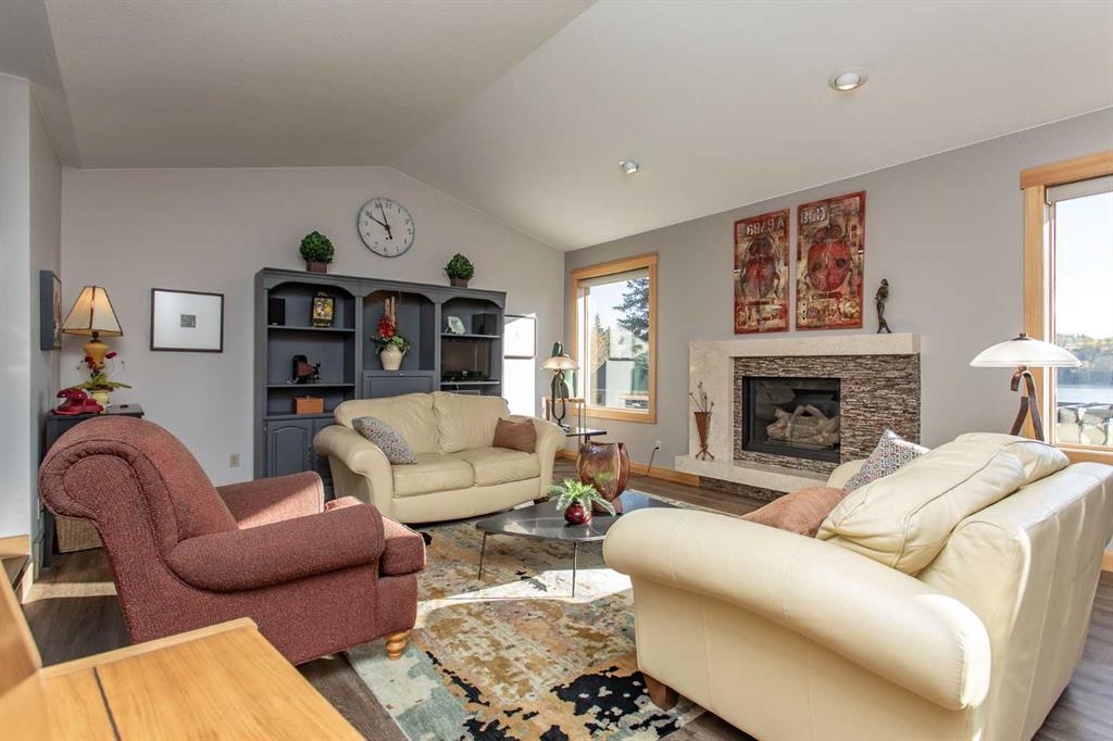 Step inside to find a warm, welcoming main floor with vaulted ceilings, luxury vinyl plank and hardwood flooring, and an abundance of natural light. The chef-inspired kitchen features quartz countertops, custom cabinetry, and stainless steel appliances—perfectly designed for both entertaining and everyday living. The adjoining sunken living room, complete with a cozy gas fireplace, is an inviting spot to unwind & enjoy the views.